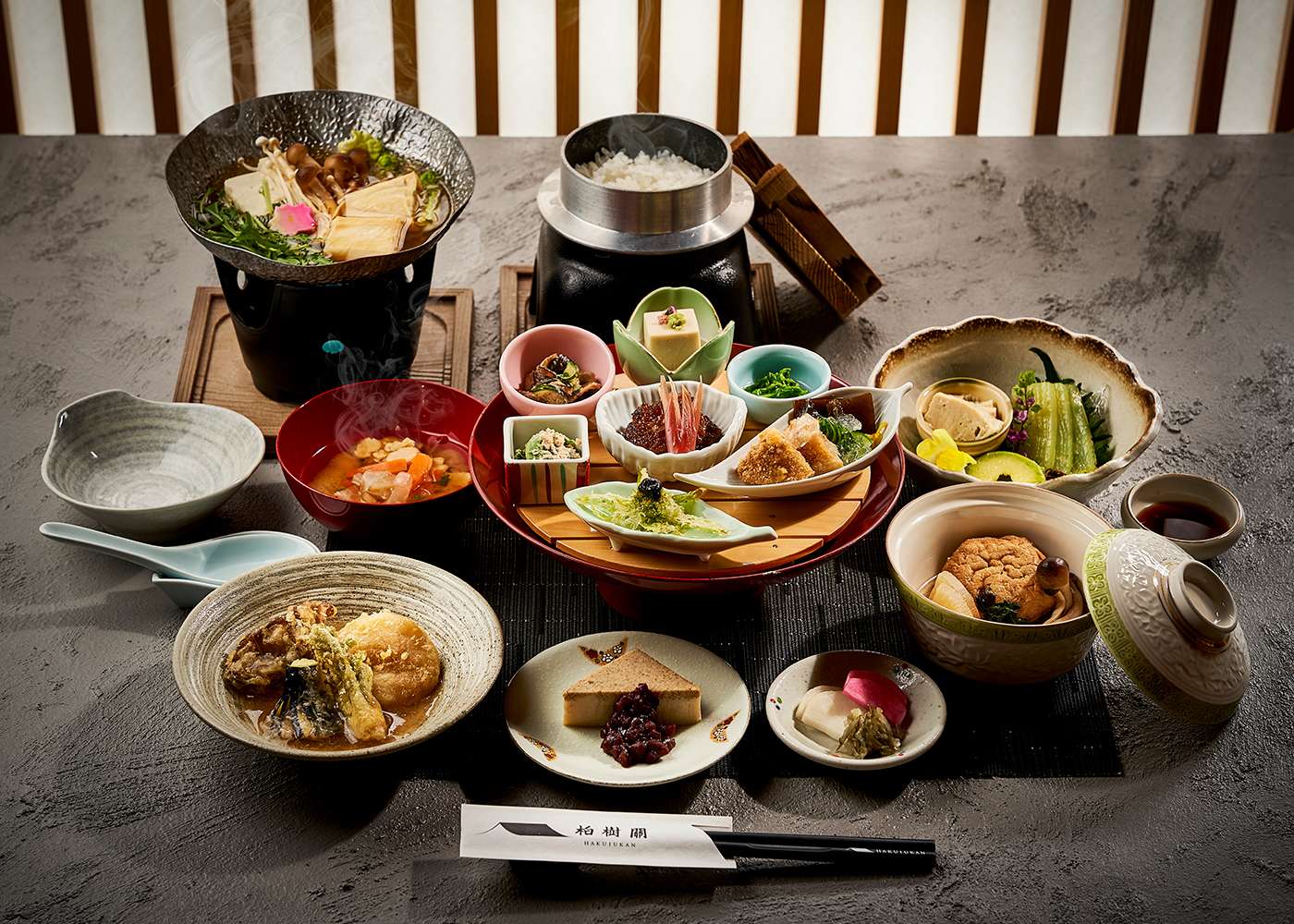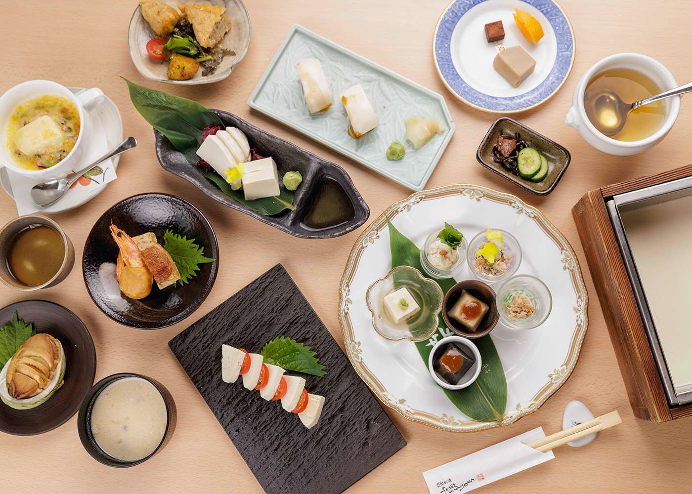 Located just beyond the temple grounds is Hakujukan, a contemporary temple inn. Here, guests can experience Zen Buddhist hospitality through meditation, open-air baths, and tofu-centered meals served in kaiseki banquet style. The cuisine reflects seasonal dishes inspired by shojin ryori that use fresh, local ingredients including tofu. Dining at Hakujukan emphasizes mindful eating and simplicity utilizing foraged ingredients from the surrounding mountains and avoiding waste whenever possible.