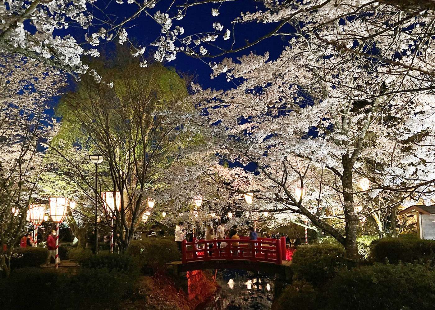 Located at the foot of 204–meter Mt. Utsubuki, this park in Kurayoshi, Tottori Prefecture, is home to about 1,000 cherry trees. At night during the Kurayoshi Spring Festival, the blossoms are illuminated by the warm glow of around 500 traditional paper lanterns hanging above the footpaths.