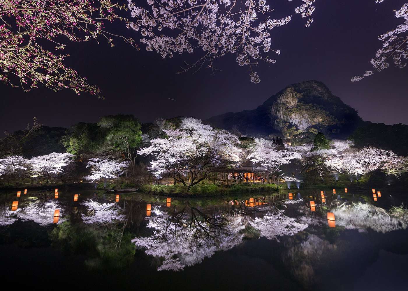 In Takeo, Saga Prefecture, Mifuneyama Rakuen hosts Kyushu’s largest nighttime cherry-blossom illumination, with approximately 2,000 trees glowing against the backdrop of Mt. Mifune’s towering cliff face. The vast scale of the display is breathtaking—transforming this two-acre park into a natural theater of light and color.