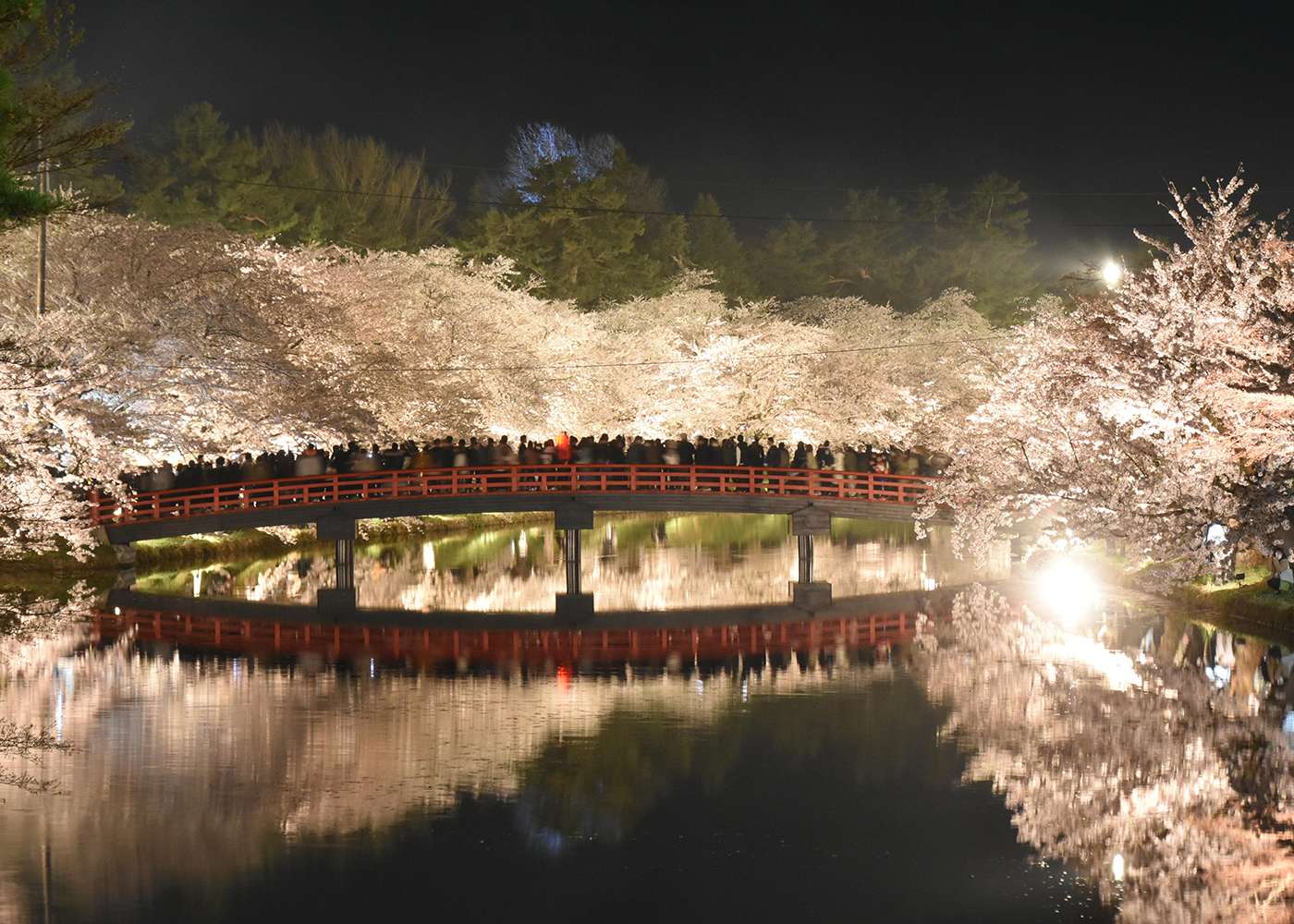 Located on the grounds of Hirosaki Park in Hirosaki, Aomori Prefecture, is Hirosaki Castle. Although only a few remnants of the castle stand today, such as the three-story castle keep, the park itself features lots of waterways that once served as the castle’s moats. Come flower viewing season, the white and pink blossoms of some 2,600 cherry trees envelop the park—and eventually carpet the ground and the water when their petals fall like snow.