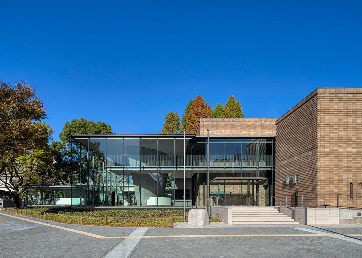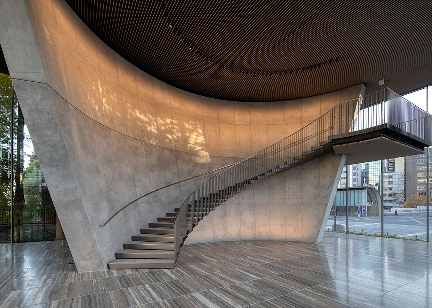Large glass panels allow natural light to flood the lobby and enable visitors to appreciate the greenery in Nakanoshima Park.